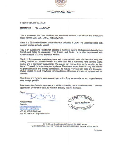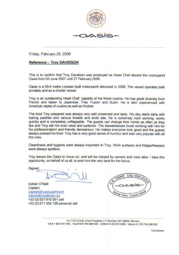 I would wholeheartedly recommend Troy as a head chef to any yacht and would eagerly welcome the opportunity to work with him again.
