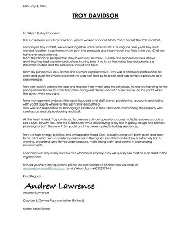 I would wholeheartedly recommend Troy as a head chef to any yacht and would eagerly welcome the opportunity to work with him again.
